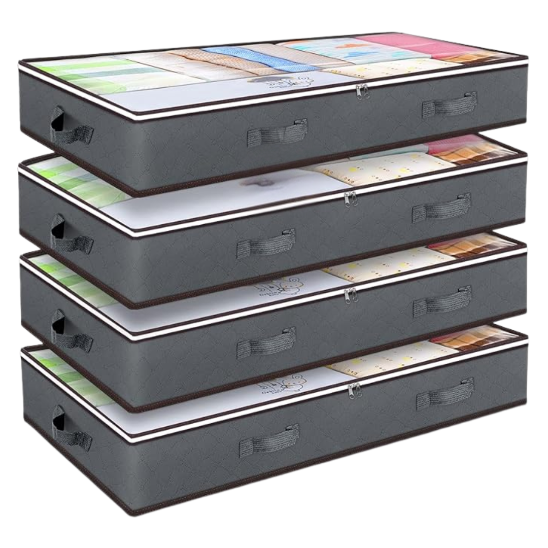 Each under-bed storage container provides 90 liters of usable space in a low-profile rectangular design, ideal for storing bedding, seasonal clothes, shoes, or soft household items. Measuring 39.37 inches in length, 19.68 inches in width, and 5.9 inches in height, the bins fit easily under most beds and furniture. Reinforced sides and a full-lid zipper allow loading and unloading without losing shape.